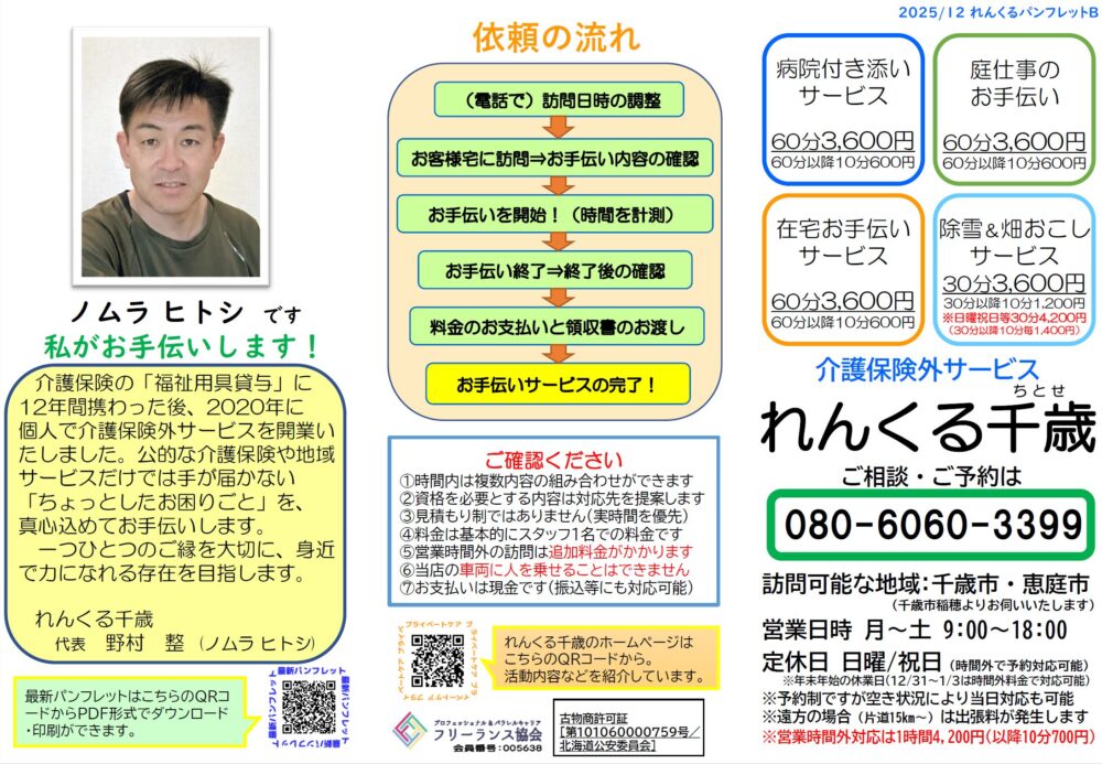 ※パンフレットはお電話&メールをいただけると、千歳市・恵庭市に限りますが直接お持ちいたします。その他の地域はご相談ください。