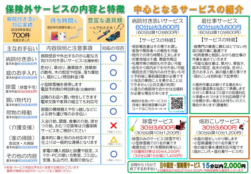千歳市・恵庭市内にお住まいの方向けに介護保険外(自費)サービスを行っています。