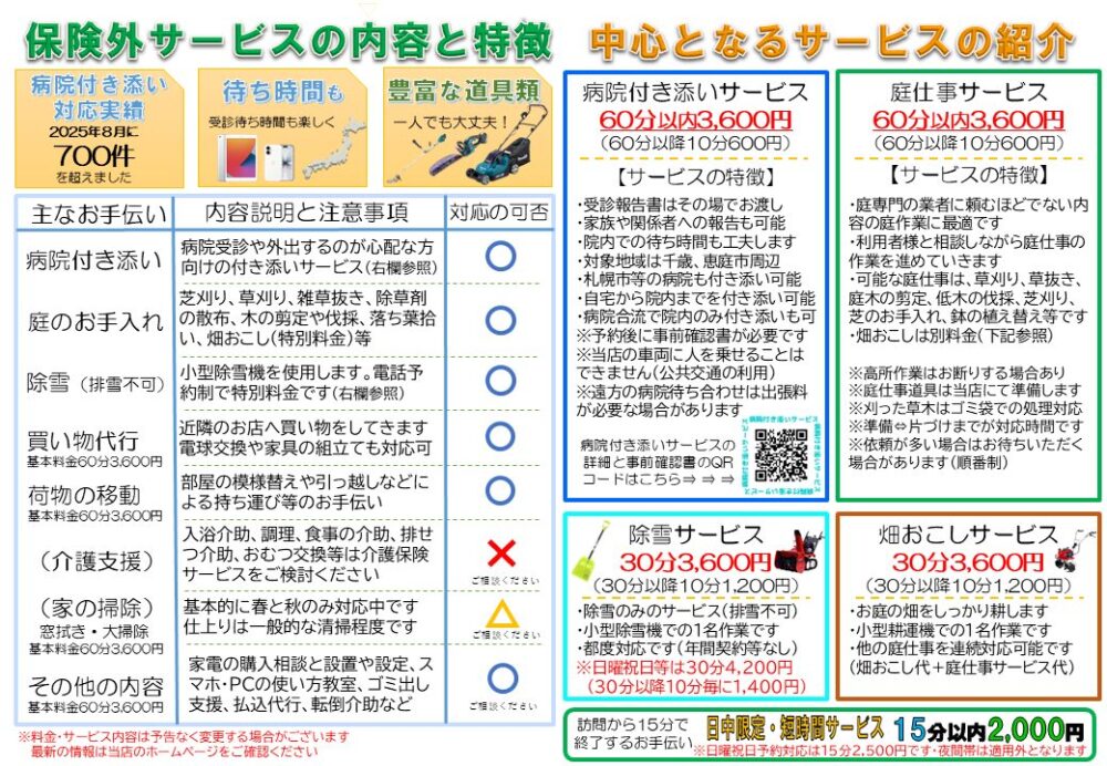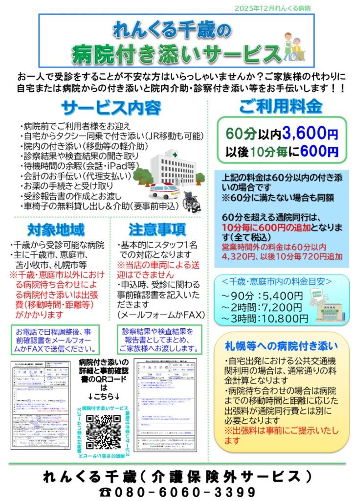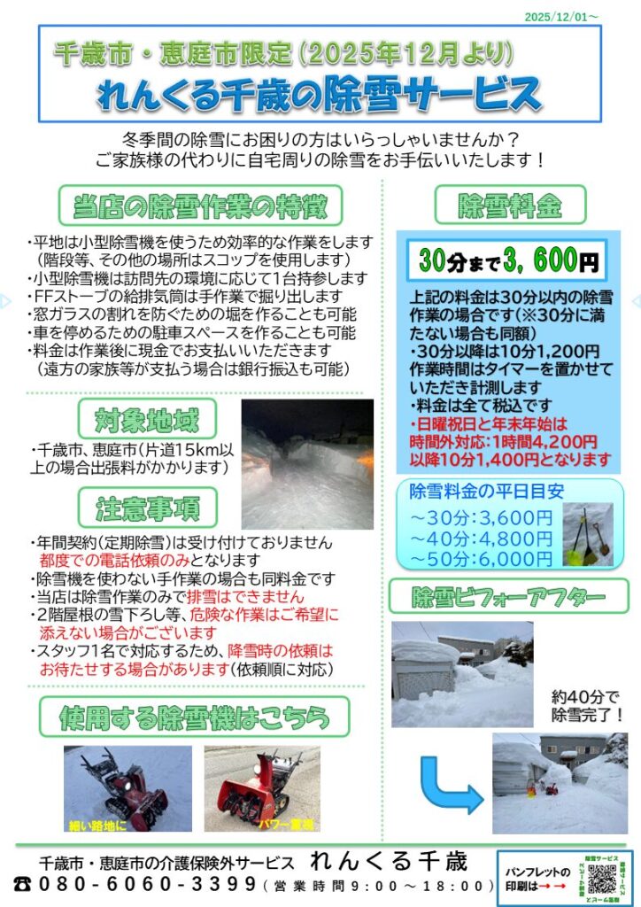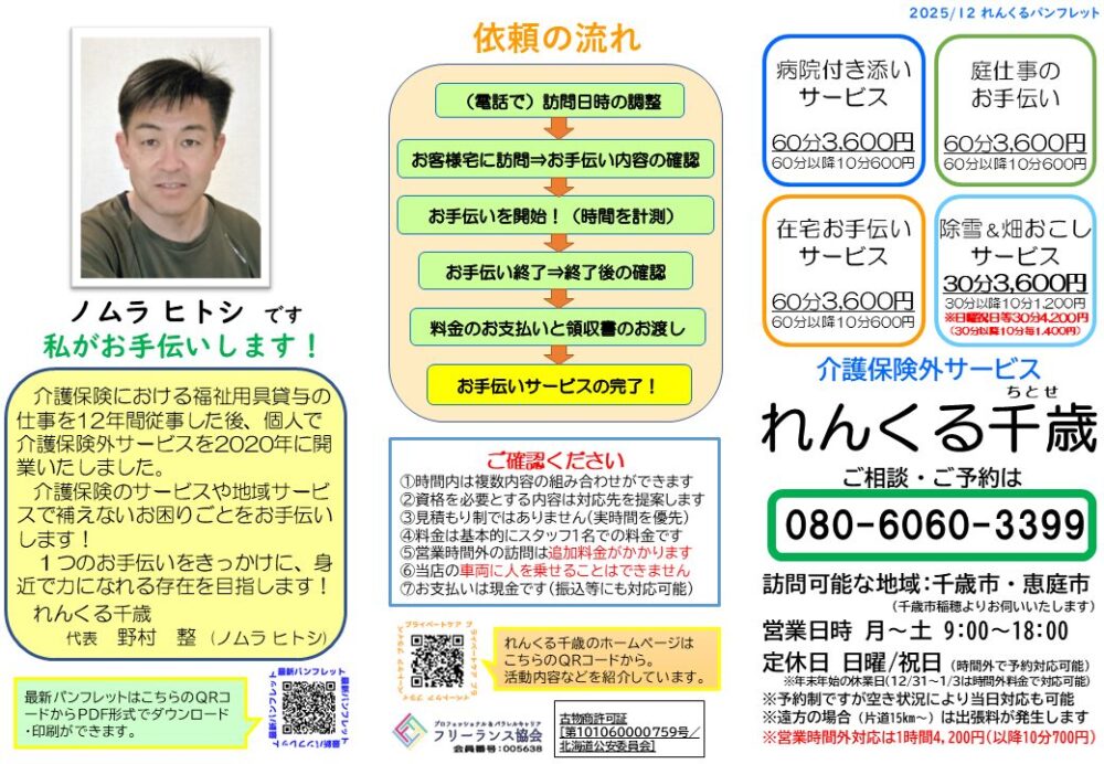 介護保険外サービスのパンフレット 2025.11.21 急遽、最新パンフレットを印刷したい場合や、タブレット等でご利用者様にご覧いただく場合は、こちらのページをご参照ください。パンフレットと同じデータを参照・印刷できます。(介護保険外サービスのパンフレットは短辺綴じを推奨いたします。) 下記のページをクリック(タップ)することによりPDF形式の画像が開かれます 目次 れんくる千歳のパンフレット病院付き添いサービスのパンフレット除雪サービスのパンフレット れんくる千歳のパンフレット 病院付き添いサービスのパンフレット 除雪サービスのパンフレット