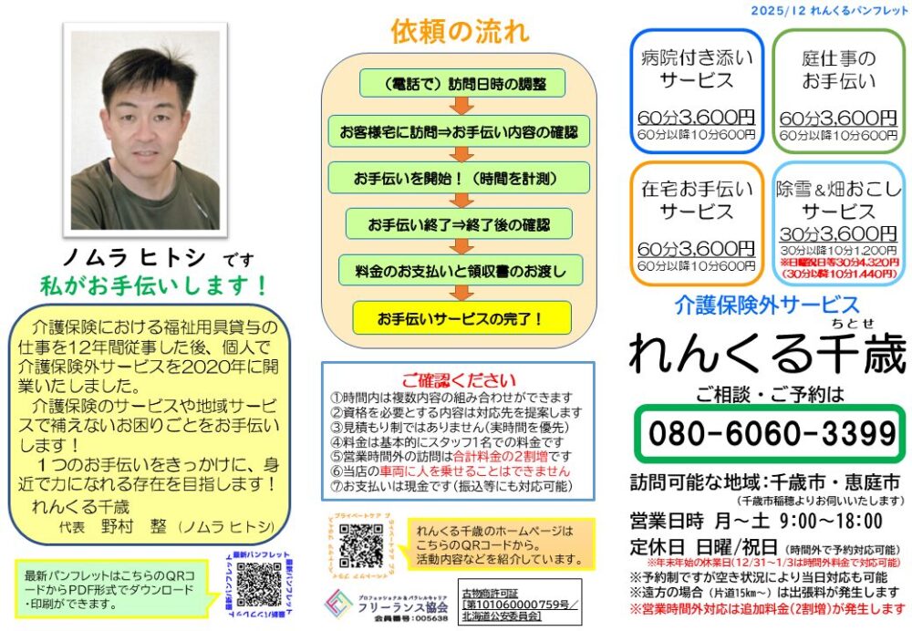 ※パンフレットはお電話&メールをいただけると、千歳市・恵庭市に限りますが直接お持ちいたします。その他の地域はご相談ください。