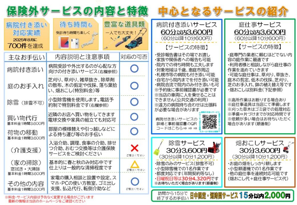 千歳市・恵庭市内にお住まいの方向けに介護保険外(自費)サービスを行っています。